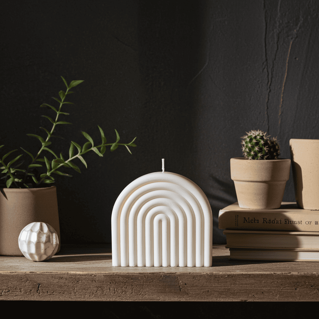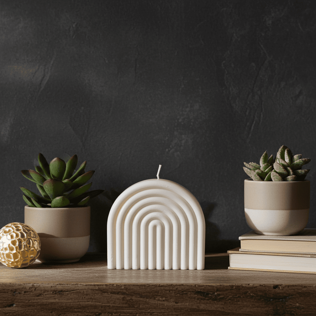 Kształt tęczy łuk sprawia, że świeca staje się niepowtarzalnym elementem dekoracyjnym, który przyciąga wzrok i dodaje charakteru przestrzeni. Geometryczny, łagodny design świetnie komponuje się z naturalnymi materiałami, takimi jak drewno, kamień czy rośliny, tworząc spójną i przytulną atmosferę.